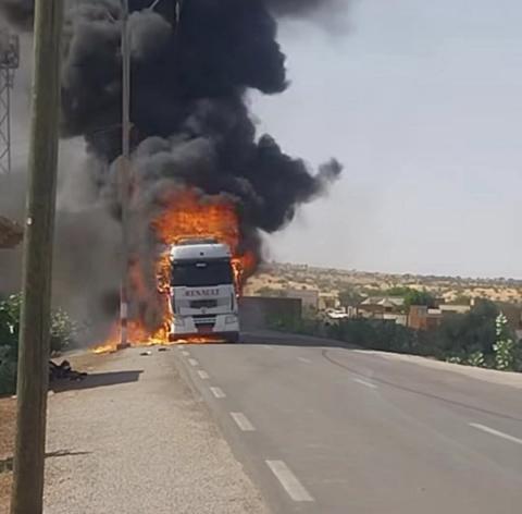 وقد التهم الحريق الشاحنة مع حمولتها بشكل كامل وحولها إلى رماد.