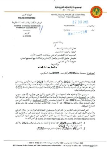 في اجراء غير مسبوق أمرالوزير الأمين العام للحكومة مختار حسينو لام أعضاء الحكومة ومن في رتبتهم بإعداد حصيلة بالإصلاحات والإنجازات التي قامت بها قطاعاتهم الحكومية خلال سنة 2025، وكذا آفاق عملهم للعام