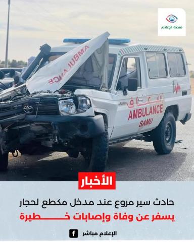 أدي حادث سيروقع هذا المساء عند المدخل الغربي لمدينة مقطع لحجار، حيث اصطدمت سيارة أنفسيس بسيارة إسعاف في حدود الساعة الثالثة ظهرا وقد أسفر الحادث عن وفاة سائق سيارة الإسعاف على الفور، فيما أصيب عد