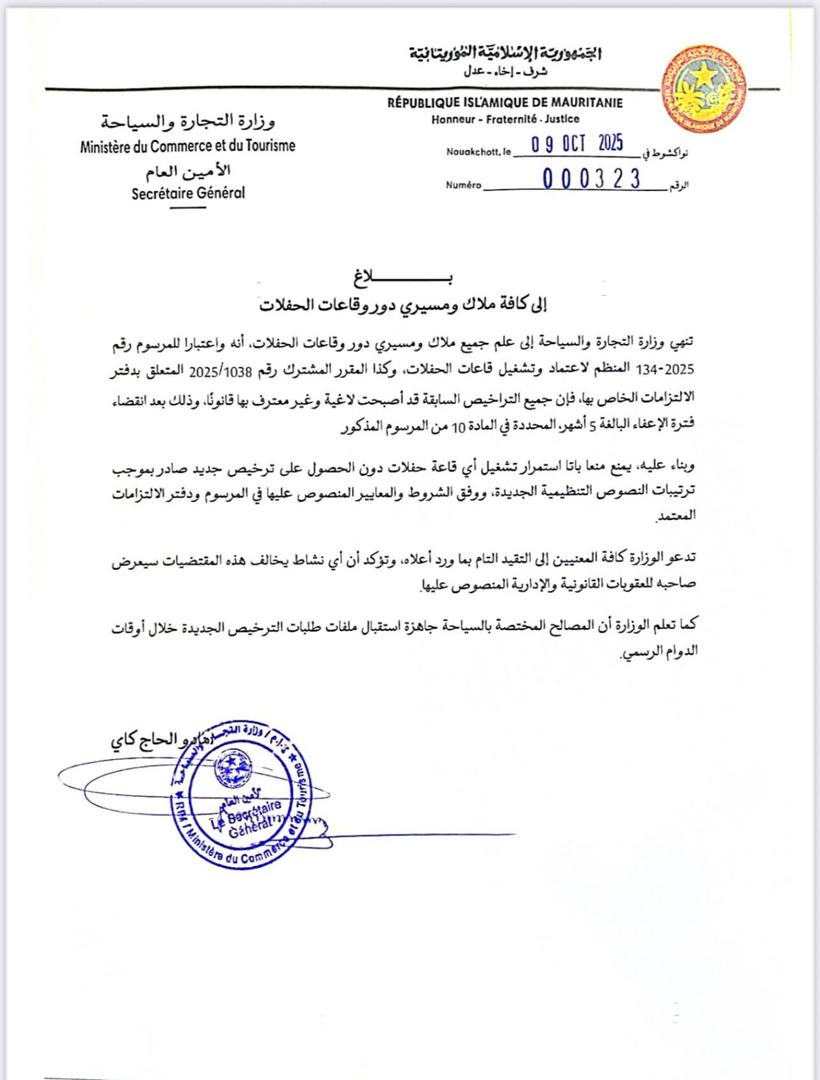 وأكدت الوزارة أنه يمنع منعا باتا استمرار تشغيل أي قاعة حفلات دون الحصول على ترخيص بموجب ترتيبات النصوص التنظيمية الجديدة، ووفق الشروط والمعايير المنصوص عليها في المرسوم، ودفتر الالتزامات المعتمد.