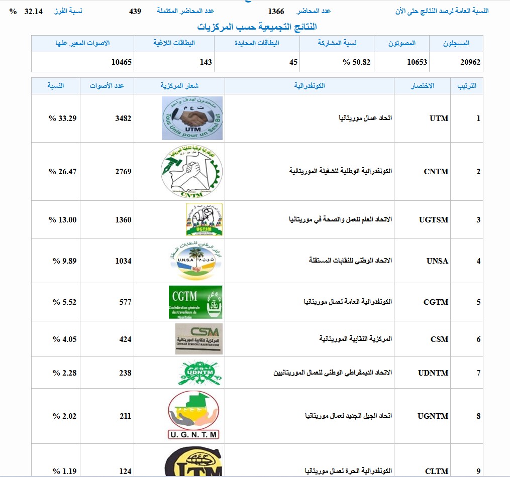 تصدر اتحاد عمال موريتانيا نتائج انتخابات التمثيلية النقابية بعد فرز32% من الأصوات، وذلك بحصوله على 3482 صوتا أي نسبة 33%.