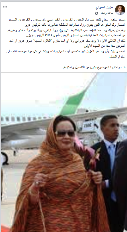 قال الكاتب الصحفي عزيز ولد الصوفي والمدير الناشر لصحيفة "الساحة" عبر صفحته على فيسبوك نقلا عن مصدر خاص به إن من يقفون وراء مبادرة المطالبة بمأمورية ثالثة للرئيس محمد ولد عبد العزيز المنتهية مأمورياته وفق الدستور الموريتاني، هم جناح تألبه السيدة حرم الرئيس ويحي ولد حدمين ووزير المالية والاقتصاد المختار ولد أجاي، وفق السيناريو الذي كشفه الزميل، وسرد فيه اسماء اصحاب تلك المبادرة، مضيفا انه سيقوم بكشف التفاصيل لاحقا.